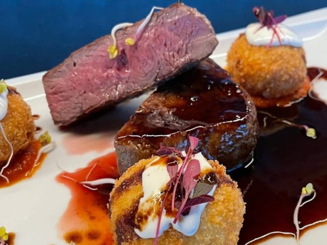 Goveđi odrezak s rimskim njokima, aromatiziran pancetom, ljutikom, kremom od mrkve i demiglasom. Sastojci: Goveđi odrezak, vino, slanina, parmezan, mlijeko, jaje, mrkva, ljutika Alergeni: laktoza